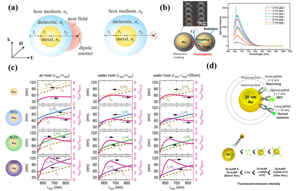 图3 (a)和(b):基于核壳结构金@介电纳米颗粒的双步骤荧光增强模型及其最优参数(rc, ts)示意图;(c):结合不同TiO₂间隙塌陷纳米指中尼罗蓝荧光强度的等离子体增强荧光能量转移机制示意图;(d):20个金纳米粒子与FITC间双链DNA长度产生MEF效应的原理示意图。