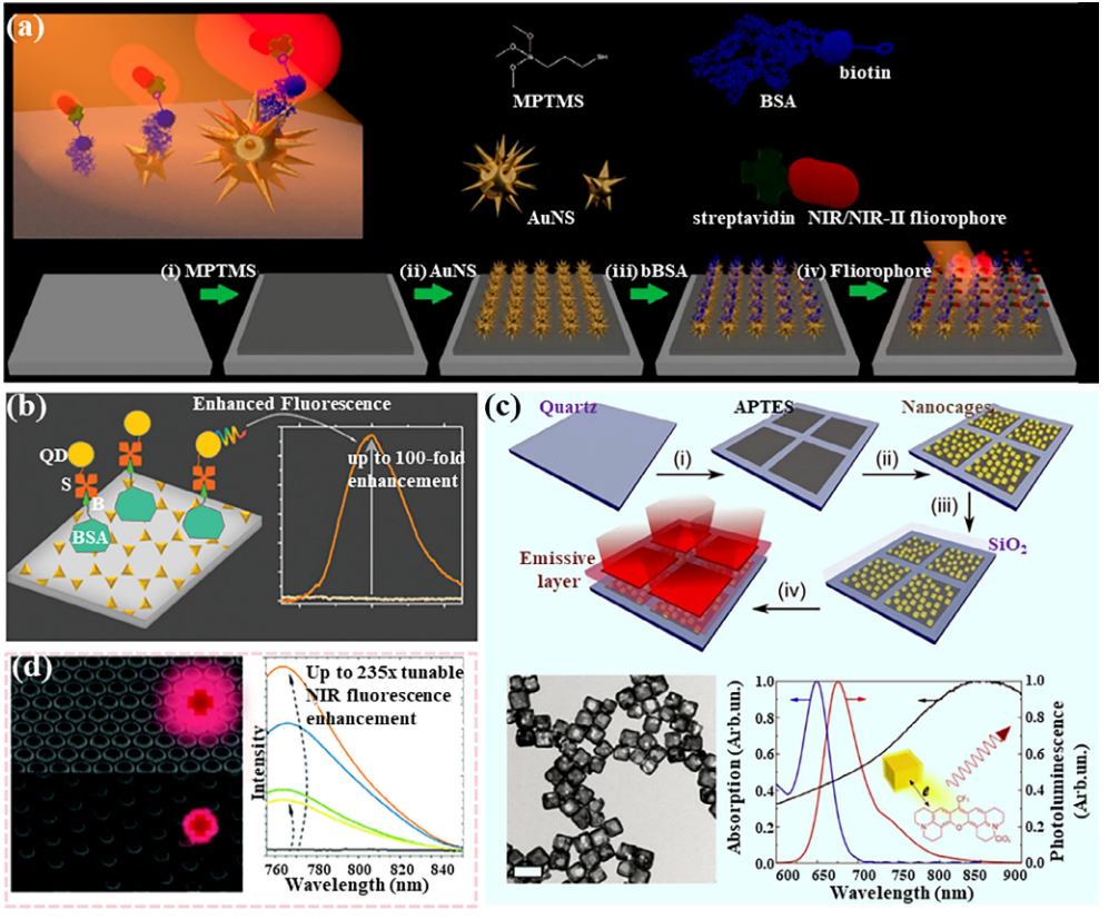 图2采用刺状金纳米星的基底在NIR及NIR-II波段展现出优异的金属增强荧光性能;(b) 金纳米结构阵列荧光增强示意图;(c) 基于金纳米笼的MEF基底制备流程,包含纳米笼透射电镜图像、LD700染料的衰减光谱(蓝线)与发射光谱(红线),以及纳米笼消光光谱(黑线);(d) 荧光增强的金纳米圆盘扫描电镜图像及其近红外增强荧光光谱。