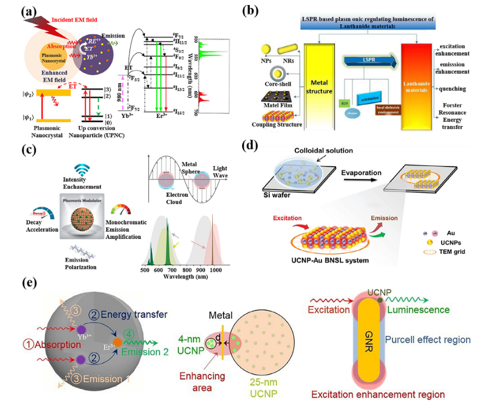 (e)金纳米棒(AuNRs)尺寸效应诱导的UCNPs等离子体增强发光,以及单个UCNP的等离子体双共振增强发光原理图。