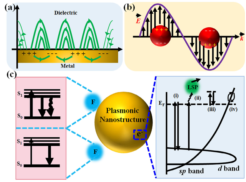 图1 (a) 表面等离子体激元传播示意图;(b) 球形纳米颗粒SPR示意图;(c)等离子体纳米结构示意图、距离调控的荧光增强机制及直接发光的可能电子跃迁过程。