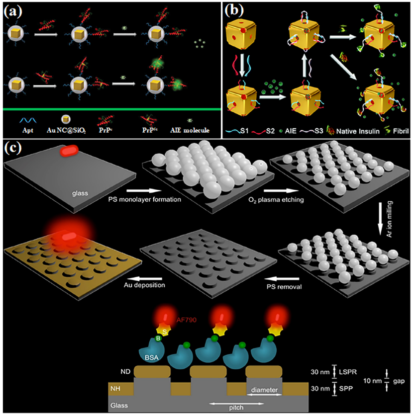 图4 (a) 基于AIE分子的金属增强荧光传感器检测朊病毒蛋白示意图。 (b) 目标触发控制释放型等离子体增强荧光AIE传感器检测天然和纤维化胰岛素示意图。(c) 采用纳米球光刻技术制备三维金纳米孔-纳米盘阵列的工艺流程示意图。