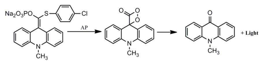 本产品适用于以碱性磷酸酶为标记物的化学发光免疫检测体系,如碱性磷酸酶磁微粒化学发光免疫分析、碱性磷酸酶板式化学发光免疫分析、Western免疫印迹发光检测等。其原理是(4-氯苯巯基)(10-甲基-9,10-二氢化吖啶亚甲基)磷酸二钠盐在碱性环境及碱性磷酸酶存在条件下,脱去一份子磷酸基团,形成不稳定的中间体化合物,该化合物在返回基态的过程中释放出光子(450nm)。在一定碱性磷酸酶浓度范围内,产生的信号值与碱性磷酸酶浓度成正比关系,通过将碱性磷酸酶标记于抗体或抗原上,可实现免疫分析物的定量检测。