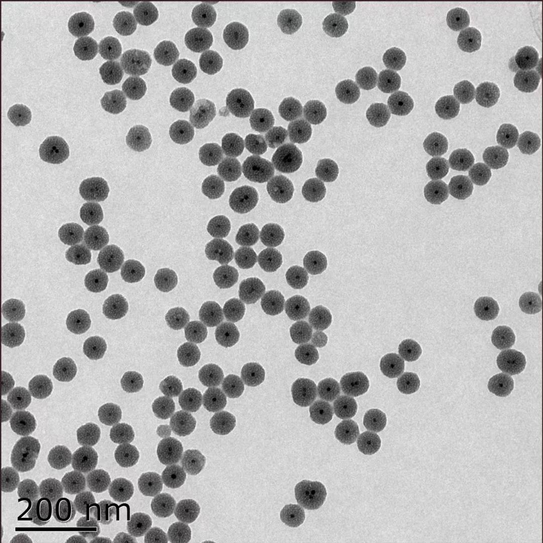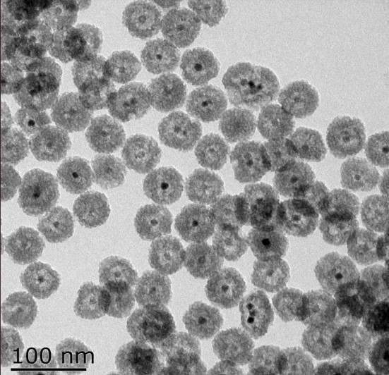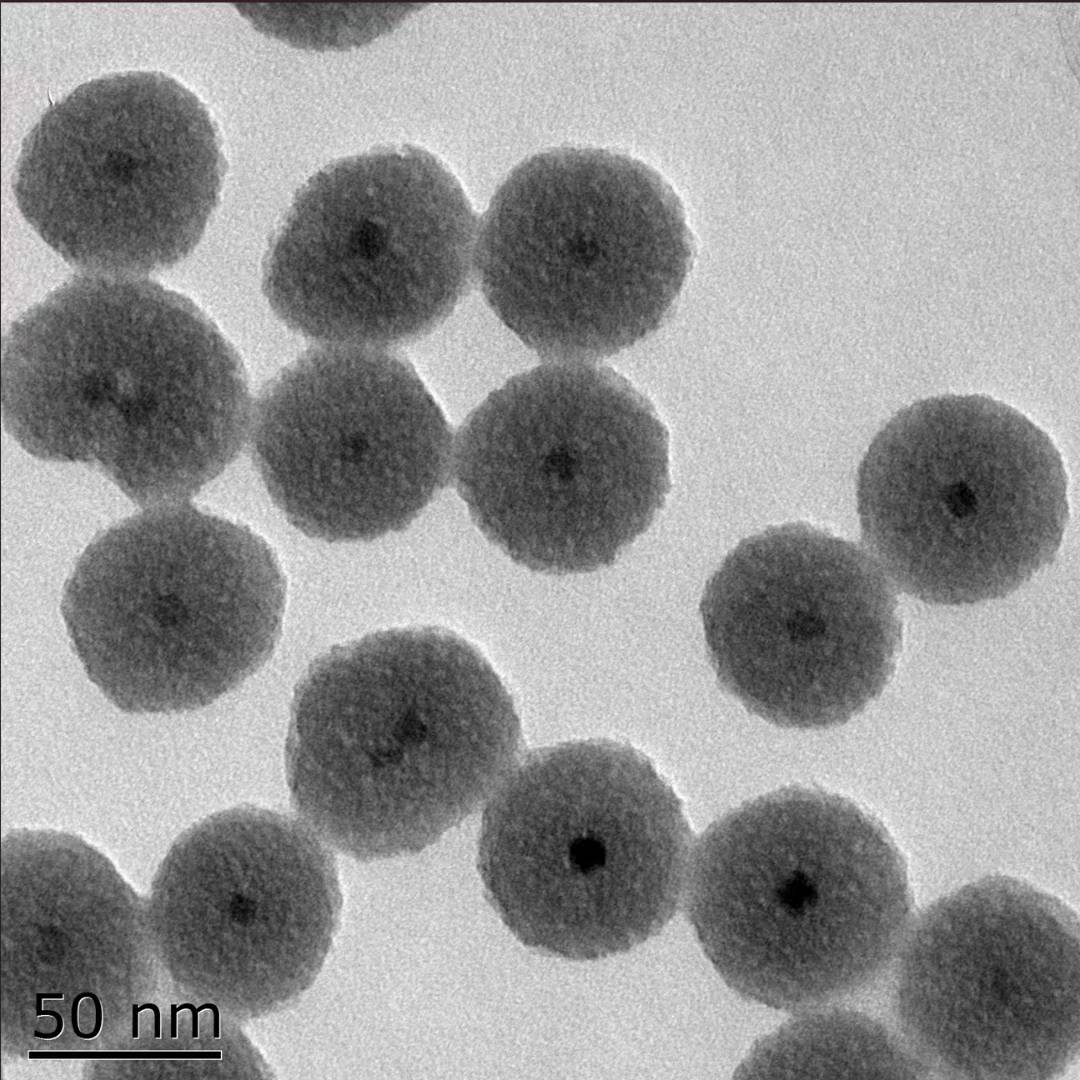 1)磁性介孔二氧化硅纳米颗粒透射电镜参考图(内核尺寸:5-10nm、硅层尺寸:~20nm、总体尺寸:~50nm、孔径大小:~2nm):